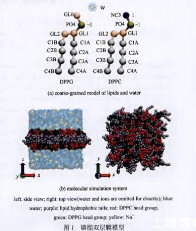 自然界的磷脂雙層膜由兩層磷脂單分子組裝而成,是生命活動的重要載體。磷脂膜的生物相容性使得其在生物傳感器、仿生納濾膜和生物膜反應(yīng)器等領(lǐng)域呈現(xiàn)良好的應(yīng)用前景。闡釋外力作用下磷脂膜破裂過程的規(guī)律,對于磷脂膜和基于磷脂膜的器件設(shè)計及應(yīng)用具有重要的基礎(chǔ)意義。表面張力是磷脂膜所受到的最重要外力之一,磷脂膜在高強(qiáng)度表面張力及其快速變化作用下會加速破裂。微管吸吮實驗表明,當(dāng)表面張力在(10~30)×10?5N·cm?1的范圍內(nèi),磷脂囊泡就會發(fā)生破裂,磷脂囊泡破裂亦與表面張力的施加速度有關(guān)。然而磷脂膜的破裂是發(fā)生在分子尺度上的微秒級變化,尚難以直接通過實驗研究磷脂膜破裂的分子機(jī)制。分子模擬為研究磷脂膜的破裂提供了有力工具。Tieleman等利用全原子分子動力學(xué)模擬發(fā)現(xiàn)對于純DPPC磷脂膜,當(dāng)橫向的機(jī)械拉伸力大于?200×10?5Pa時,磷脂膜會發(fā)生不可逆的破裂。Groot等采用耗散粒子動力學(xué)研究了表面活性劑對張力下磷脂膜的破裂行為的影響,模擬結(jié)果顯示表面活性劑的存在降低了磷脂膜的可拉伸性并且降低了磷脂膜所能承受的最大表面張力。Leontiadou等采用分子動力學(xué)的方法研究了純DPPC膜中親水性孔道的結(jié)構(gòu)及磷脂膜的破裂,結(jié)果表明當(dāng)磷脂膜的表面張力低于38×10?5N·cm?1時,膜中的親水性孔道可以保持穩(wěn)定的結(jié)構(gòu);而當(dāng)表面張力大于該值時,孔道結(jié)構(gòu)逐步擴(kuò)大并最終導(dǎo)致膜的破裂。Lai等的研究表明,直徑小于0.5 nm的納米粒子有助于水分子進(jìn)入磷脂雙分子層并誘導(dǎo)磷脂膜破裂;而直徑大于0.7 nm的納米粒子則有助于穩(wěn)定磷脂膜。Xie等采用分子動力學(xué)模擬展示了表面張力的施加速度對于純DPPC磷脂膜破裂的影響。總體而言,從分子水平上揭示磷脂組成對磷脂膜破裂的影響機(jī)制以及對非恒定表面張力作用下磷脂雙層膜的破裂規(guī)律的研究尚有待深入。