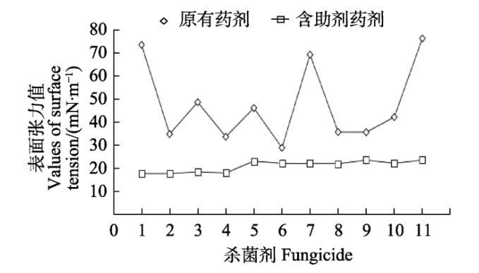 參照各供試殺菌劑田間推薦劑量,分別配置10 mL藥液2組,其中一組添加助劑,一組不含助劑。通過表面張力儀測試各藥液的表面張力值。每組設(shè)置3個(gè)重復(fù),以水作為空白對(duì)照。