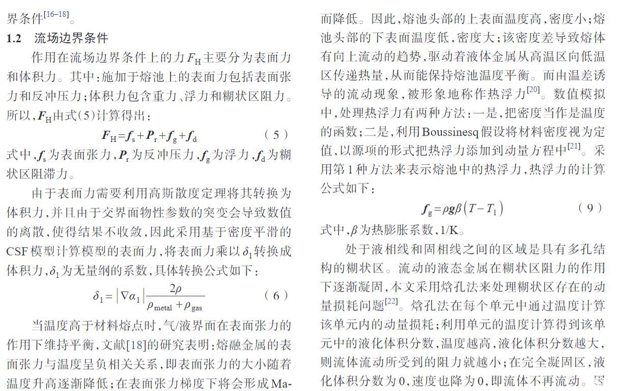 作用在流場邊界條件上的力FH主要分為表面力和體積力。其中:施加于熔池上的表面力包括表面張力和反沖壓力;體積力包含重力、浮力和糊狀區(qū)阻力。所以,F(xiàn)H由式(5)計(jì)算得出: