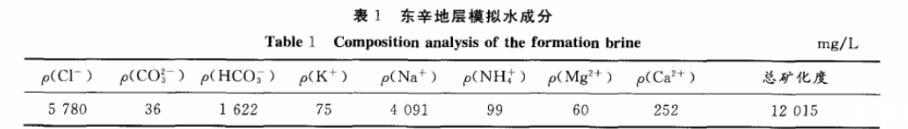 實(shí)驗(yàn)原料為勝利油田東辛采出原油。航空煤油為北京化學(xué)試劑公司,室溫下與重蒸后的去離子水的界面張力約為40 mN/m;實(shí)驗(yàn)用水為經(jīng)重蒸后的去離子水配制的東辛地層模擬水,其主要成分見表1。