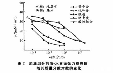 本文采取四組分分離方法(SARS)得到飽和分、芳香分、膠質(zhì)和瀝青質(zhì),利用醇?jí)A萃取法得到酸性活性組分,系統(tǒng)研究了這五類原油活性組分與東辛地層水間的界面張力及界面擴(kuò)張流變性質(zhì),有助于深入理解原油乳狀液的界面膜穩(wěn)定機(jī)理。
