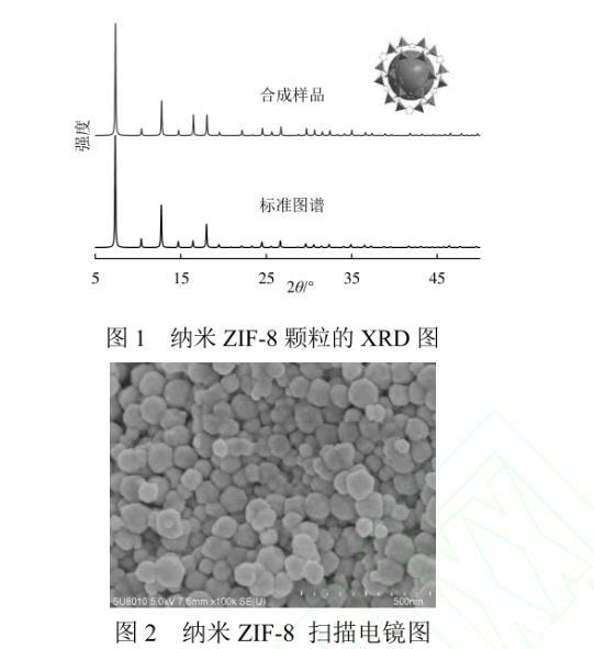 納米ZIF-8顆粒的XRD譜圖如圖1所示。合成的樣品譜圖分布與標(biāo)準(zhǔn)譜圖匹配,且所獲得的衍射峰與文獻(xiàn)吻合,未出現(xiàn)雜峰,表明制備的樣品具有單一相且結(jié)晶度良好。由謝樂公式計算得到晶粒尺寸約為70 nm。由納米ZIF-8顆粒的掃描電鏡照片可見,ZIF-8顆粒形貌為六邊形,平均尺寸為65.8 nm,與XRD計算結(jié)果一致。