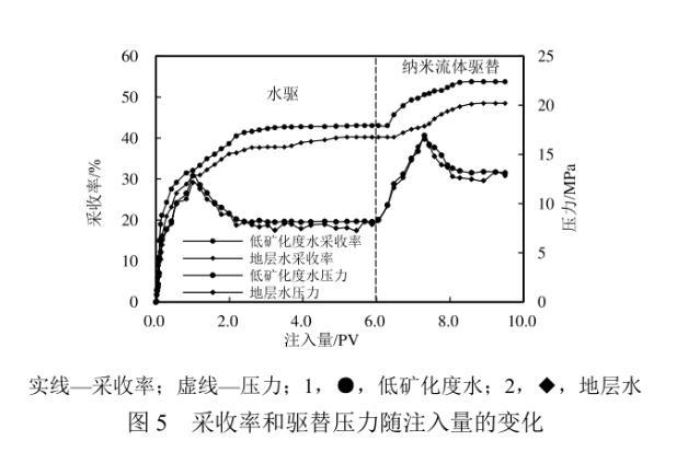 在驅(qū)油機理實驗探究的基礎(chǔ)上,優(yōu)選納米ZIF-8顆粒質(zhì)量分?jǐn)?shù)為0.03%的納米流體進(jìn)行巖心驅(qū)替實驗。采收率及驅(qū)替壓力隨注入體積的變化如圖5所示。使用模擬地層水、低礦化度水首次驅(qū)替至無油產(chǎn)出時的采收率分別為40.24%、43.06%。轉(zhuǎn)注含納米ZIF-8顆粒的流體后,受益于巖石表面潤濕性向著更加水濕轉(zhuǎn)變以及油水間界面張力的降低,油滴更易被剝落,且在流動過程中更易被注入液包裹形成乳狀液,增強了微觀驅(qū)替效率,從而使得最終采收率分別提高了8.25百分點和10.71百分點。注入納米流體后,驅(qū)替壓力得到了一定的提升。這可能是由于納米顆粒堵住了部分高滲通道,流體向孔滲條件較差的小孔隙流動,從而提高了波及效率,在一定程度上也有助于采收率的提高。