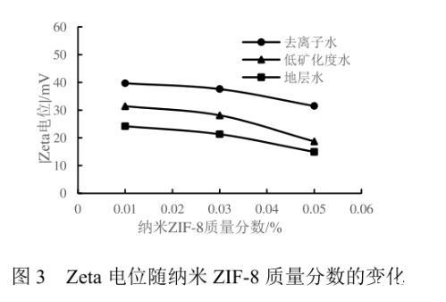 納米ZIF-8流體的穩(wěn)定性是評價其能否作為驅(qū)油劑的重要性質(zhì)之一。將裝有不同濃度納米流體的樣品瓶靜置15 d后,當(dāng)ZIF-8的質(zhì)量分?jǐn)?shù)為0.01%、0.03%時,納米顆粒在不同礦化度的流體中均保持穩(wěn)定狀態(tài),無沉淀生成,說明適當(dāng)濃度的納米ZIF-8顆粒在水中有著良好的穩(wěn)定性。當(dāng)ZIF-8的質(zhì)量分?jǐn)?shù)為0.05%時,靜置后的納米流體產(chǎn)生了少量沉淀,表明過高濃度的ZIF-8會互相聚結(jié),導(dǎo)致顆粒變大,進(jìn)而發(fā)生聚沉。
