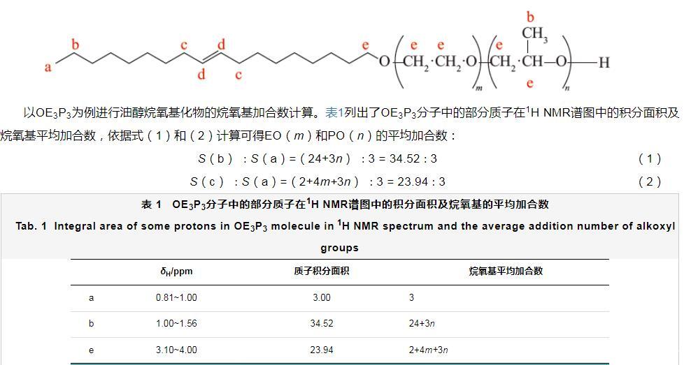 以OE3P3為例進行油醇烷氧基化物的烷氧基加合數(shù)計算。表1列出了OE3P3分子中的部分質(zhì)子在1H NMR譜圖中的積分面積及烷氧基平均加合數(shù),依據(jù)式(1)和(2)計算可得EO(m)和PO(n)的平均加合數(shù):