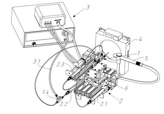 S1:通過所述集成化微流量泵控模塊2,基于預(yù)設(shè)的流速比例向樣品石英毛細管1.3輸送樣品液1.7,向內(nèi)鞘液石英毛細管1.2輸送內(nèi)鞘液1.6,向外鞘液不銹鋼管1.1輸送外鞘液1.5;