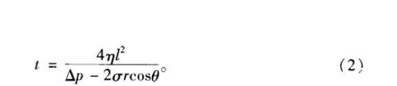 表示。式中,σ為表/界面張力,r為孔隙平均半徑,θ為潤濕角。因此,對于特定的儲層,破膠液表/界面張力越低且與巖石接近中性潤濕則返排能力越強。同時,根據(jù)Poiseulle方程,當返排壓差為Δp時,從半徑為r、長為l的毛細管中排出黏度為η、表/界面張力為σ和接觸角為θ的液體所需時間