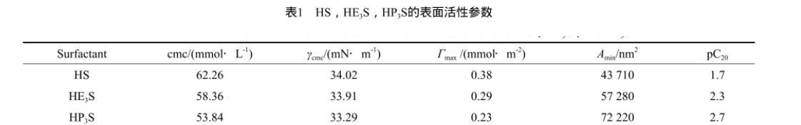 表1 HS,HE3S,HP3S的表面活性參數(shù)