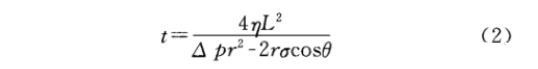 從式(1)可以看出,助排劑的表/界面張力越低,巖石越接近中性潤濕,則毛細(xì)管力越小,越有利于返排。另外,根據(jù)Poiseulle方程,當(dāng)排驅(qū)壓差為△p(MPa)時,從半徑為r(m),長為L(m)的毛細(xì)管中排出黏度為η(mPa·s),表面張力為σ(mN/m)和接觸角為θ(°)的液體所需時間t(s)的表達(dá)式為: