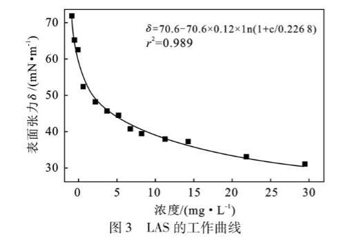 LAS是應(yīng)用最廣泛的陰離子表面活性劑,是我國合成洗滌劑活性物的主要構(gòu)成,可用作洗衣粉、香波、金屬清洗劑、脫墨劑等產(chǎn)品的原料,分析其生物降解性能十分必要。LAS試樣在不同濃度時測定的表面張力結(jié)果見表3。