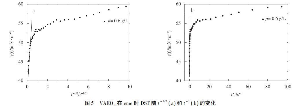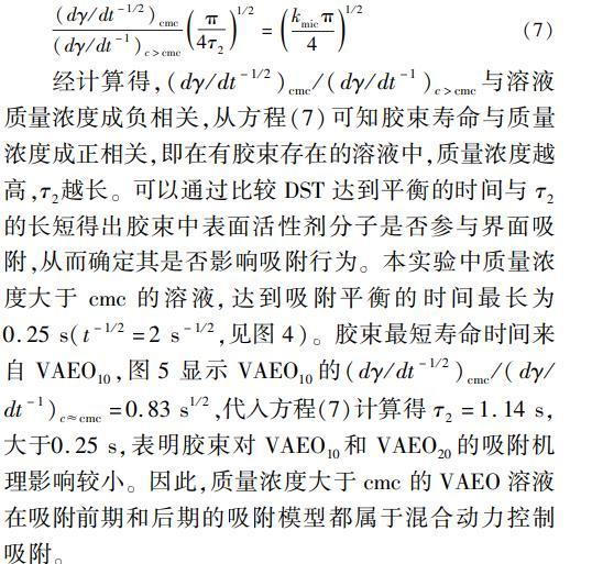 經(jīng)計算得,(dγ/dt-1/2)cmc/(dγ/dt-1)c>cmc與溶液質(zhì)量濃度成負(fù)相關(guān),從方程(7)可知膠束壽命與質(zhì)量濃度成正相關(guān),即在有膠束存在的溶液中,質(zhì)量濃度越高,τ2越長。可以通過比較DST達(dá)到平衡的時間與τ2的長短得出膠束中表面活性劑分子是否參與界面吸附,從而確定其是否影響吸附行為。本實驗中質(zhì)量濃度大于cmc的溶液,達(dá)到吸附平衡的時間最長為0.25s(t-1/2=2s-1/2,見圖4)。膠束最短壽命時間來自VAEO10,圖5顯示VAEO10的(dγ/dt-1/2)cmc/(dγ/dt-1)c≈cmc=0.83s1/2,代入方程(7)計算得τ2=1.14s,大于0.25s,表明膠束對VAEO10和VAEO20的吸附機(jī)理影響較小。因此,質(zhì)量濃度大于cmc的VAEO溶液在吸附前期和后期的吸附模型都屬于混合動力控制吸附。