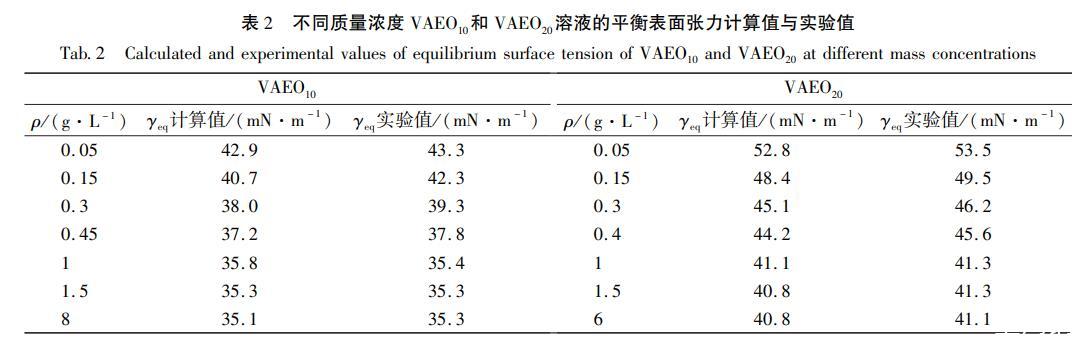 從以上對VAEO10和VAEO20在氣/液界面的吸附行為的研究可知,當(dāng)質(zhì)量濃度小于cmc時,二者在吸附前期均表現(xiàn)為擴(kuò)散控制吸附,擴(kuò)散系數(shù)D的數(shù)量級為10-11m2/s,在吸附后期均為混合動力控制吸附,表觀擴(kuò)散系數(shù)Da的數(shù)量級為10-12m2/s.膠束存在時,τ2較長,大于到達(dá)γeq所需時間teq,膠束形成不影響表面張力隨時間的變化趨勢。據(jù)文獻(xiàn)報道,壬基酚聚氧乙烯醚(NPEO9)濃度小于cmc時的擴(kuò)散系數(shù)為3.9×10-10m2/s(滴體積法),平衡表面張力為30.6mN/m,可推測NPEO10的擴(kuò)散系數(shù)在3.9×10-10m2/s附近,大于本研究中VAEO10的擴(kuò)散系數(shù)。VAEO的疏水部分分子結(jié)構(gòu)比NPEO的大,前者較后者多一個縮醛環(huán)和一個甲氧基,這兩個基團(tuán)一方面造成VAEO的空間體積較大,另一方面,縮醛環(huán)中的——O-與水分子可能形成氫鍵,均增加了VAEO擴(kuò)散時的阻力,因而降低了擴(kuò)散速率。