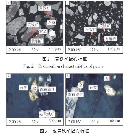 由圖3可知:磁黃鐵礦在礦石中主要以嵌布形式存在,主要嵌布于脈石礦物粒間,少量嵌布在脈石礦物裂隙中。嵌布于脈石礦物粒間的磁黃鐵礦粒度以大于0.037 mm為主,而嵌布在脈石礦物裂隙中的磁黃鐵礦多呈細脈狀構(gòu)造產(chǎn)出。常見金礦物與磁黃鐵礦連晶嵌布于脈石礦物粒間,這表明磁黃鐵礦與金礦物之間存在密切的關系,磁黃鐵礦同樣是主要載金礦物。