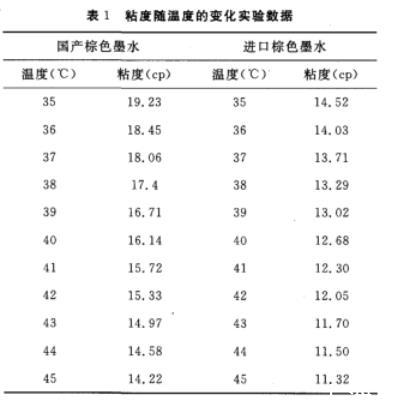 陶瓷墨水粘度隨著溫度的升高而降低的原因是由于陶瓷墨水的主要成分是有機油類溶劑,所以隨著溫度的升高,有機溶劑分子之間的引力降低,分子之間的內(nèi)摩擦力減少,使得剪切力減少,表觀為粘度數(shù)值減小(見圖1)。
