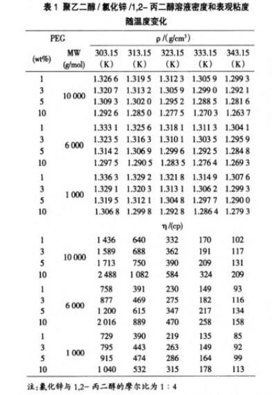 表1聚乙二醇/氯化鋅/1,2-丙二醇溶液密度和表觀粘度隨溫度變化