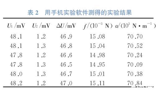 利用改裝后的液體表面張力系數(shù)測量儀和手機實驗軟件記錄實驗數(shù)據(jù),實驗數(shù)據(jù)可在手機屏幕實時顯示,拖動手機屏幕找到“拉斷液柱”時所對應的數(shù)據(jù),測得的U1和U2數(shù)據(jù)如表2所示。