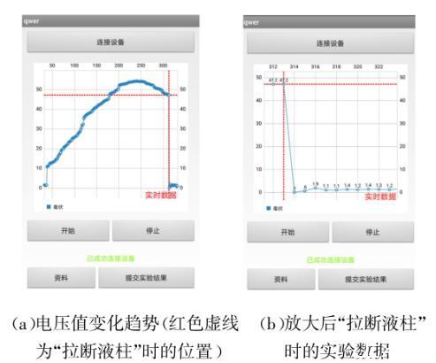 針對傳統(tǒng)實驗模式中記錄數(shù)據(jù)的缺點,在智能手機上開發(fā)了專門的實驗軟件,通過手機的藍牙連接到實驗儀器,將實驗所采集到的所有電壓表讀數(shù)實時傳送到智能手機上,然后在智能手機上以坐標點的形式描繪出電壓表讀數(shù)的變化,在智能手機端就可以觀察到金屬環(huán)與液面分離瞬間的數(shù)據(jù)變化,很方便地讀取到“拉斷液柱”瞬間的實驗數(shù)據(jù)。