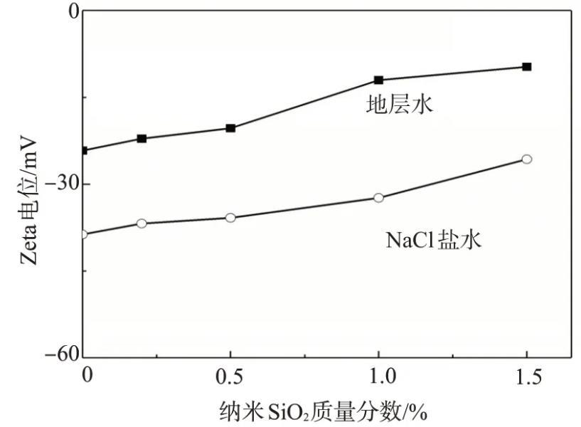 圖2給出了分別用模擬地層水和NaCl鹽水配制的不同納米SiO2含量的納米SiO2/SDS體系的Zeta電位。當(dāng)納米SiO2的質(zhì)量分?jǐn)?shù)分別為0.2%、0.5%和1.0%時(shí),用NaCl鹽水配制的納米SiO2/SDS體系的|ζ|均大于30 mV,因而表現(xiàn)出較好的穩(wěn)定性;而當(dāng)納米SiO2質(zhì)量分?jǐn)?shù)為1.5%時(shí),體系的|ζ|略低于30 mV,因此納米SiO2/SDS體系在靜置15 d后才出現(xiàn)輕微的混濁。用模擬地層水配制的納米SiO2/SDS體系的|ζ|均明顯小于30 mV,說(shuō)明體系的穩(wěn)定性差,靜置幾小時(shí)即出現(xiàn)了渾濁和沉淀。納米SiO2帶負(fù)電,金屬陽(yáng)離子Ca2+,Mg2+和Na+等的存在會(huì)壓縮納米SiO2的雙電層,由于Ca2+,Mg2+離子的價(jià)數(shù)高,壓縮雙電層的能力強(qiáng),導(dǎo)致體系的|ζ|降低,穩(wěn)定性變差,由此可見(jiàn),要使納米SiO2/SDS分散體系具有良好的穩(wěn)定性,應(yīng)減少體系中二價(jià)Ca2+、Mg2+的含量。