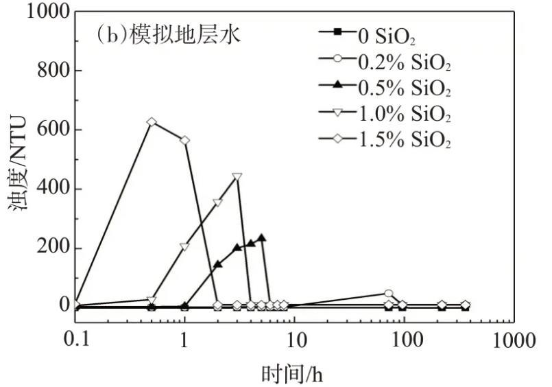 利用沉降法和濁度法分析分別用NaCl鹽水、模擬地層水配制的不同納米SiO2含量的納米SiO2/SDS體系的穩(wěn)定性,濁度法測(cè)試結(jié)果如圖1所示。用NaCl鹽水配制的SiO2/SDS體系在靜置15 d時(shí),僅納米SiO2質(zhì)量分?jǐn)?shù)為1.5%的體系出現(xiàn)了輕微的渾濁,而其它體系均保持澄清透明;當(dāng)納米SiO2質(zhì)量分?jǐn)?shù)為1.5%時(shí),SiO2/SDS體系的濁度隨靜置時(shí)間的延長(zhǎng)稍有增大,其它體系的濁度幾乎不隨靜置時(shí)間的延長(zhǎng)而變化,且均小于15 NTU。由此可見(jiàn),用NaCl鹽水配制的納米SiO2/SDS體系的穩(wěn)定性良好。