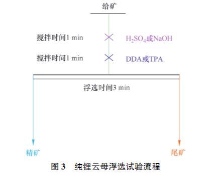 在XFG掛槽浮選機(jī)上進(jìn)行純礦物浮選試驗(yàn),轉(zhuǎn)速設(shè)為1 992 r/min。每次稱取2.00 g純礦物放入50 mL浮選槽中,然后加入40 mL超純水,用H?SO?或NaOH調(diào)節(jié)pH值,攪拌礦漿1 min,加入一定量DDA或TPA,攪拌1 min,保持充氣量恒定,充氣1 min,用刮板刮出泡沫產(chǎn)品,每間隔3 s刮1次,浮選刮泡時間為3 min。結(jié)束后將得到的泡沫產(chǎn)品(精礦)和槽內(nèi)產(chǎn)品(尾礦)分別烘干、稱量、計(jì)算回收率。進(jìn)行浮選pH及濃度試驗(yàn)時,每組試驗(yàn)設(shè)置1個平行試驗(yàn),并對浮選結(jié)果求平均值。純礦物浮選試驗(yàn)流程如圖3所示。