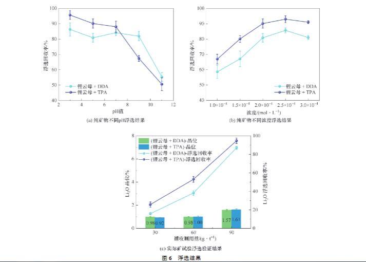 實際礦浮選試驗的檢測結(jié)果如圖6(c)所示,可以看出,在較小的捕收劑用量下,TPA或DDA作用后鋰云母精礦的品位相接近。但是,較高的產(chǎn)率使得TPA對鋰云母的浮選回收率高于DDA。實際礦檢測結(jié)果進一步證明TPA浮選性能的優(yōu)越。此外,隨著藥劑用量的加大,DDA或TPA作用鋰云母的品位與回收率均會相應(yīng)提高。