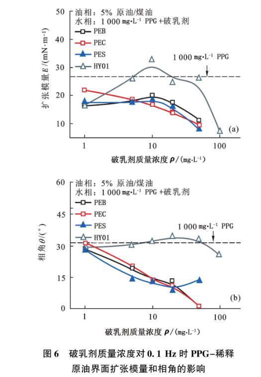 圖4不同頻率條件下PES對PPG-稀釋原油界面擴張模量和相角的影響