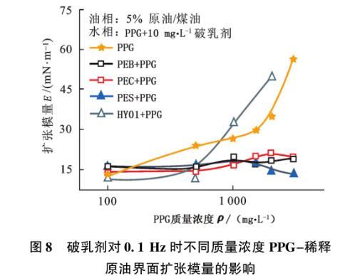 圖8破乳劑對0.1 Hz時不同質(zhì)量濃度PPG-稀釋原油界面擴張模量的影響