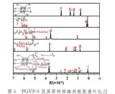 圖4為PGVF-6以及其原料的核磁共振對(duì)比圖。PGVF-6譜圖中,SH-POSS上的-SH質(zhì)子氫吸收峰已經(jīng)消失,接枝成功的APEG750單體,烯烴雙鍵的質(zhì)子氫吸收峰已經(jīng)消失,末端連接的-OH質(zhì)子氫吸收峰在5.21times 10^{-6}處;同樣反應(yīng)成功的2-壬烯酸甲酯單體,烯烴雙鍵的質(zhì)子氫吸收峰也同樣消失不見(jiàn),連接O的末端烷烴-CH3質(zhì)子氫吸收峰處于3.72x10-6的位置,末端烷烴-CH3的質(zhì)子氫吸收峰在0.88x10-6處;最后成功反應(yīng)的VDMS單體,烯烴雙鍵的質(zhì)子氫吸收峰也已經(jīng)消失,后續(xù)Si上連接的所有甲基-CH3分別處在0.12x10-6和0.08x10-6處,可以得知PGVF-6雜化材料成功合成。