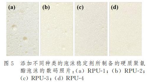 泡沫穩(wěn)定劑的存在對(duì)于硬質(zhì)聚氨酯泡沫性能影響在宏觀上有著十分顯著的體現(xiàn)。圖5是添加不同種類(lèi)的泡沫穩(wěn)定劑后制樣得到的硬質(zhì)聚氨酯泡沫橫截面的數(shù)碼照片。結(jié)果表明,接枝APEG鏈段的PAVE-5和PGVF-6泡沫穩(wěn)定劑所制備的聚氨酯泡沫RPU-3和RPU-4,其泡孔結(jié)構(gòu)相較于市售產(chǎn)品所制備的聚氨酯泡沫展現(xiàn)出了更加細(xì)膩均勻的泡孔結(jié)構(gòu),而市售產(chǎn)品所形成的泡沫則表現(xiàn)出較為粗糙且孔徑不均勻的泡孔結(jié)構(gòu)。這表明親水結(jié)構(gòu)有利于泡沫穩(wěn)定劑均勻分散在多元醇中并使得反應(yīng)充分進(jìn)行,泡孔尺寸細(xì)小致密,有利于改善硬質(zhì)聚氨酯泡沫的壓縮性能。