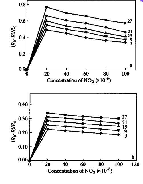 LB膜越薄,與氣體的接觸越充分,被氧化的程度也越高,因而對氣體的響應也就越快。同層的PAN/NMP LB膜較PAN-AA/NMP LB膜具有更快的響應。3層聚苯胺LB膜對相對百分比為20×10??NO?的響應時間為10 s,但是當層數(shù)增加到27層時,響應時間就上升到90 s。而對于27層的聚苯胺與乙酸的混合LB膜,響應時間就更長,接近3 min。另一方面,響應時間還隨NO?氣體濃度的增加而增長。圖5反映了15層聚苯胺LB膜的響應時間與氣體濃度變化之間的關(guān)系。在相同氣體濃度下,PAN/NMP LB膜較PAN-AA/NMP LB膜具有更快的響應和更好的靈敏度。PAN/NMP LB膜對相對百分比為20×10??NO?的響應時間為30 s,而PAN-AA/NMP LB膜則為50 s。當氣體濃度增大到相對百分比為100×10??時,響應時間分別變化到150 s和180 s。