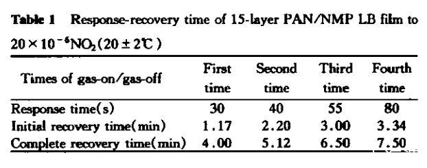 在敏感特性的測試過程中,我們發(fā)現(xiàn)純聚苯胺LB膜對NO?具有較好的敏感性。聚苯胺LB膜的敏感性及響應時間與LB膜的層數(shù)有密切關(guān)系。隨層數(shù)的增加,對NO?的響應時間逐漸增長,這可以從圖4中看出。