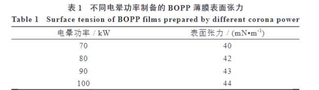 本研究使用的雙向拉伸聚丙烯薄膜原膜由公司的法國CELLER生產(chǎn)線制備,平均厚度30μm,熔點165℃。在一定預(yù)熱溫度下,原膜經(jīng)過電暈處理器以70~100 kW的功率處理后即可制得成品BOPP薄膜。