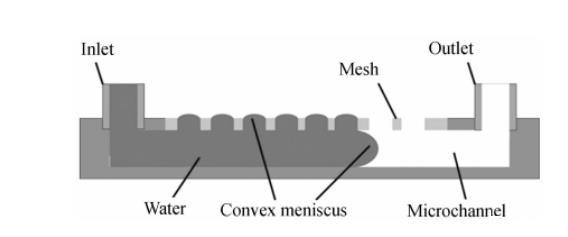 氣溶膠到水溶膠的采樣,一方面要求管道是開放的,以保證空氣中的生物質(zhì)能夠進入液體;另一方面為了避免液體在流動過程中外泄,管道必須封閉。本文設計了一種開放的管道,其頂部開放面覆蓋有疏水柵網(wǎng),如圖1所示。疏水柵網(wǎng)孔中的水在表面張力的作用下會形成一個彎月面,阻止水從柵網(wǎng)孔中流出。這樣空氣中的生物質(zhì)就能通過柵網(wǎng)孔進入管道,同時管道中的液體可以穩(wěn)定流動而不會外溢。