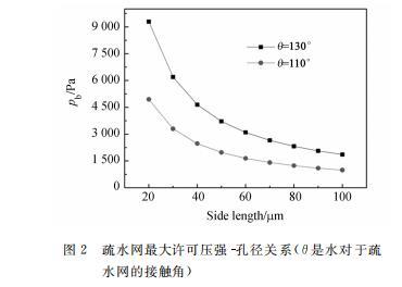 其中:sigma為液體表面張力,a為柵網(wǎng)方孔的邊長,theta為液體對于柵網(wǎng)的接觸角。計算中假設水溫為20^{circ}C,此時水的表面張力系數(shù)sigma=0.0728~N/m(后面計算中都采用此參數(shù))。最大許可壓強Pb和孔邊長的關系如圖2所示,可以看到采用疏水性好、網(wǎng)孔小的柵網(wǎng)可以得到更大的Pb。