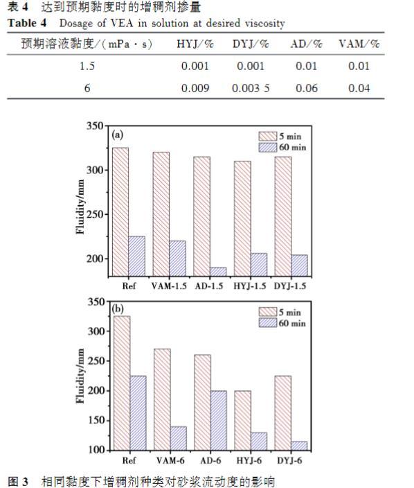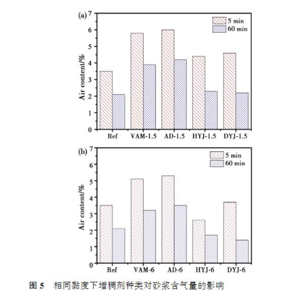 增稠劑溶液的黏度越高,砂漿的流動(dòng)度越低。在較低黏度下,四種增稠劑對砂漿初始流動(dòng)度的影響接近,60min時(shí),AD的經(jīng)時(shí)流動(dòng)度最低,VAM流動(dòng)度相對于基準(zhǔn)砂漿略微下降;然而當(dāng)溶液黏度提高至6mPa·s時(shí),摻入HYJ和DYJ的砂漿流動(dòng)度顯著低于AD和VAM,60min后的損失也更大,AD的經(jīng)時(shí)流動(dòng)度略低于基準(zhǔn)砂漿。
