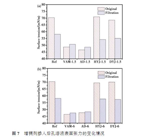 相同摻量下,DYJ的黏度最高,其次是HYJ,VAM和AD黏度在低摻量下接近,摻量達(dá)到0.10%之后,VAM黏度高于AD;VAM和AD的黏度隨著摻量的提高緩慢增大,而HYJ和DYJ溶液的黏度隨摻量的提高迅速提高,尤其是DYJ的增長幅度更為顯著。總體來看,增稠劑分子量越大,相同摻量時(shí)溶液的黏度越高。從表面張力的結(jié)果來看,相同摻量下,HYJ溶液的表面張力最高,其次是DYJ,VAM和AD的表面張力顯著低于其他兩種增稠劑,且AD略微高于VAM.