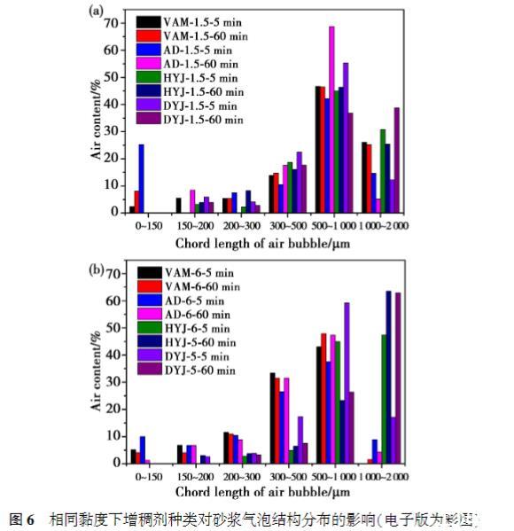 氣泡結(jié)構(gòu)測試表明,砂漿黏度越高,氣泡結(jié)構(gòu)集中于較大尺寸范圍內(nèi)。隨著時(shí)間推移,高黏度體系下,500——1000μm的氣泡含量顯著下降,而1000——2000μm的氣泡含量則顯著提高;低黏度體系下,300——500μm的氣泡含量有所增大。