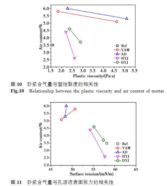 當(dāng)溶液黏度為1.5mPa·s時(shí),VAM和AD的摻入使砂漿初始含氣量相對于基準(zhǔn)砂漿增大66%和71%,而HYJ和DYJ僅使初始含氣量提高26%和31%;當(dāng)溶液黏度為6mPa·s時(shí),VAM和AD的摻入使砂漿初始含氣量相對于基準(zhǔn)砂漿增大46%和51%,而DYJ僅使初始含氣量提高6%,HYJ則降低含氣量26%.