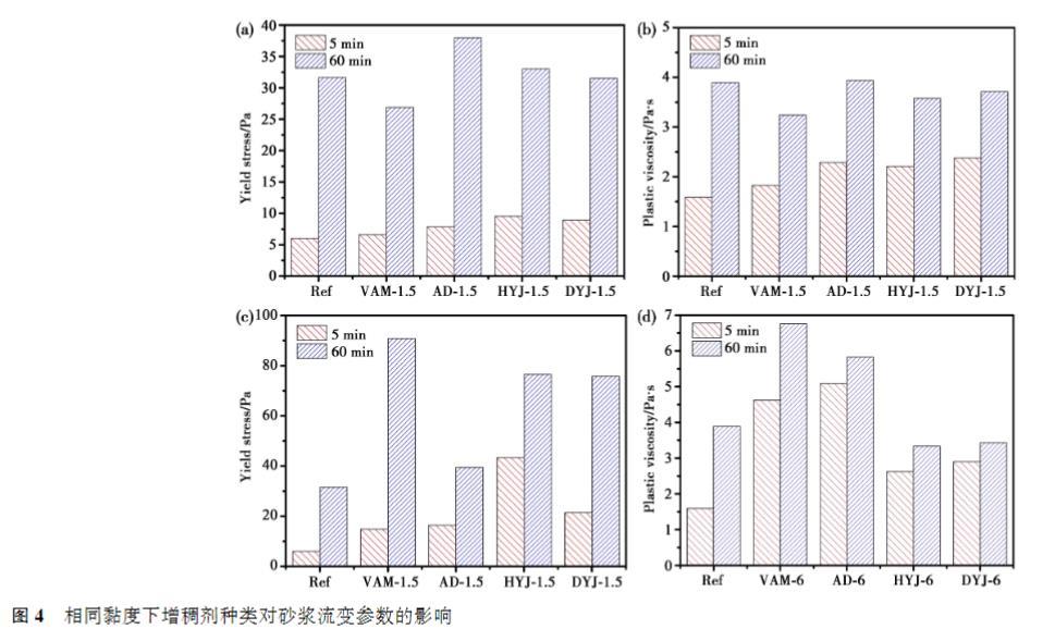 (1)增稠劑的加入顯著降低砂漿的流動(dòng)度,提高砂漿的屈服應(yīng)力和塑性黏度。