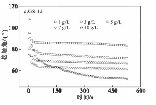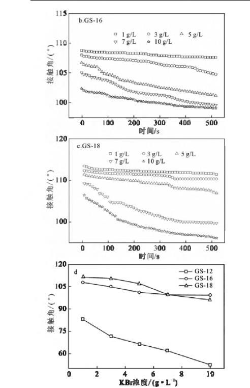 在KBr濃度區(qū)間1~10 g/L內(nèi),GS-12隨著KBr濃度的增加,接觸角顯著減小,而GS-16和GS-18則變化不明顯。可以解釋為:對于GS-12而言,KBr濃度越高,固/液界面處的填料越緊密,導(dǎo)致氣/液固界面張力值降低,而疏水鏈較長的GS-16和GS-18其自身降低界面張力的能力有限,所以,隨KBr濃度增加,接觸角變化有限[1,19]。此外,隨著KBr濃度的增加,液滴在石蠟?zāi)ど系慕佑|角值減小。