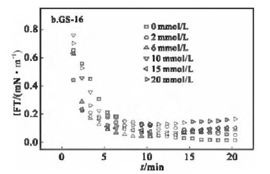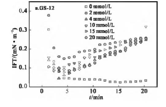 表面活性劑/油體系的動態(tài)界面張力行為,對驅(qū)油過程具有重要意義。動態(tài)界面張力是驅(qū)油過程中各種復(fù)雜物理化學(xué)反應(yīng)的具體體現(xiàn)。因此,研究動態(tài)界面增長力及其影響因素非常重要。溶液中離子強(qiáng)度增加,將影響表面活性劑分子在水相中的溶解度,改變雙電層參量,而導(dǎo)致油水界面表面活性劑濃度的改變。一般情況下,添加的鹽可以通過中和表面活性劑分子在界面上頭基的電荷來減弱表面活性劑分子之間的靜電斥力,導(dǎo)致IFT降低[5]。溫度為30℃下,不同KBr鹽濃度下,GS-12,GS-16的煤油/表面活性劑溶液界面張力隨時(shí)間的變化曲線見圖6。