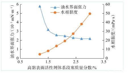 圖1 OBU-3低黏表面活性劑體系含量對界面張力和水相黏度的影響