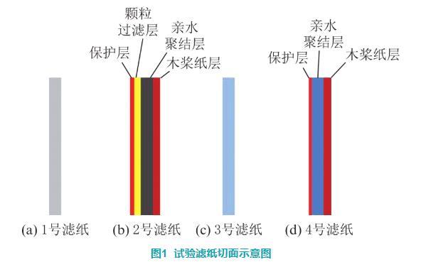 濾紙的切面結構如圖1所示。1號濾紙為單層親水材料。2號濾紙由保護層a、顆粒過濾層b、親水聚結層c和木漿紙層d組成,木漿紙作為基層材料,c和d層、b與c層均由樹脂粘結,a與b層通過超聲波焊接在一起。3號濾紙為聚四氟乙烯編織而成的單層網(wǎng)狀濾紙。4號濾紙由保護層a、疏水過濾層b和基層c組成,4號濾紙的粘結工藝與2號濾紙相同,保護層和疏水層由超聲波焊接在一起,基層和疏水層使用樹脂進行粘結。
