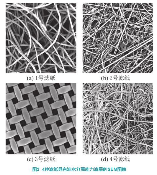 使用Phonem Pro X掃描電子顯微鏡(scanning electron microscope,SEM)在500倍放大倍率下拍攝的4種濾紙的微觀結構如圖2所示。1號濾紙由直徑約為15μm的親水纖維構成;2號濾紙的親水層由粗細不同的纖維通過樹脂粘接而成,其中粗纖維還起到增加親水層物理強度的作用;3號濾紙由直徑約為45μm的聚四氟乙烯纖維絲編制,兩根纖維之間的距離約為44μm;4號濾紙的b層由疏水材料通過熔噴工藝制成,在平面上纖維分布疏密不均但在空間內有著較好的孔隙分布。除了3號濾紙外,其余濾紙均具有油水分離層,同時也具有較為復雜的空間結構。