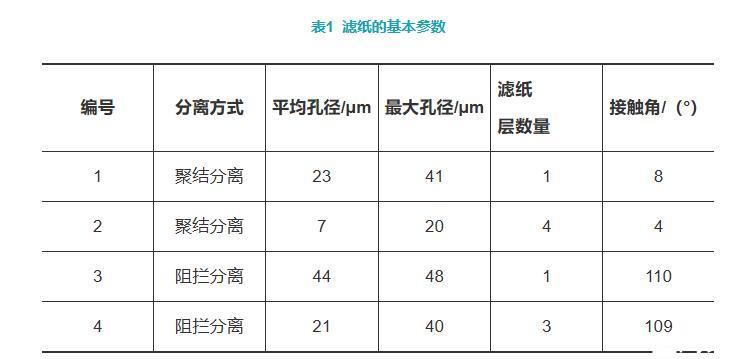 聚結式濾紙分離水的主要步驟為:(1)從不混溶的液體中傳輸小水滴到過濾器;(2)小水滴附著在纖維表面;(3)因聚結使附著在纖維上水滴的尺寸增加;(4)水滴在纖維上的合并和傳輸;(5)水滴因為重力脫離濾紙表面落到集水槽內。阻攔式濾紙分離水的原理是利用疏水纖維的疏水性,把水顆粒阻攔在濾紙表面,通過黏性聚結生長成的大水滴在重力的作用下脫離濾紙表面。