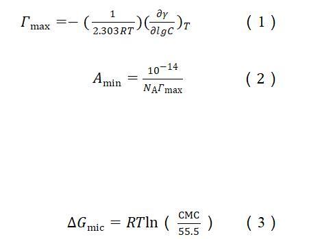 根據(jù)表面張力和濃度的關(guān)系曲線,使用吉布斯吸附等溫線〔方程(1)〕計(jì)算出表面活性劑分子吸附在氣液界面的最大表面過(guò)剩濃度(Гmax)。