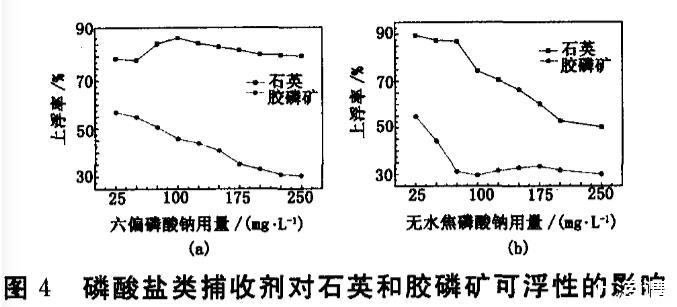 除了上述調(diào)整劑,含有磷酸根的六偏磷酸鈉及無(wú)水焦磷酸鈉也可抑制膠磷礦,這類磷酸鹽除了可以在酸性條件下抑制膠磷礦外,還能在礦漿中起到一定的分散作用。試驗(yàn)結(jié)果見(jiàn)圖4。