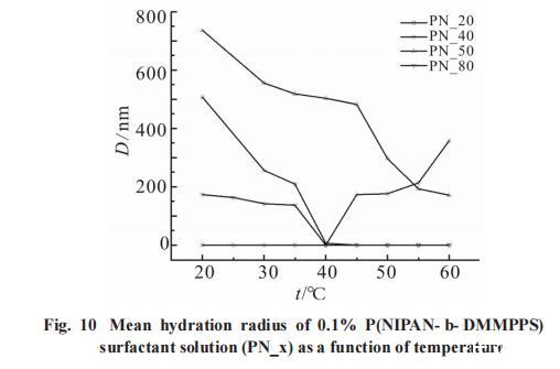 從Fig.10可以觀察到,低溫條件下,PN_20的平均水合半徑大約為500nm,PN_50的水合半徑在750nm左右。此階段,這2種聚合物均形成了膠束結(jié)構(gòu),并從水溶液中析出。當(dāng)溫度升高時(shí),兩者的水合半徑均表現(xiàn)出明顯的減小趨勢(shì),表明它們?cè)谒械娜芙舛仍黾印L貏e地,對(duì)于PN_50而言,激光納米粒度儀的測(cè)量結(jié)果顯示,其水合半徑發(fā)生突變的溫度區(qū)間位于40℃至45℃之間。這一發(fā)現(xiàn)指出,PN_50在該溫度范圍內(nèi)經(jīng)歷了熱敏性質(zhì)的顯著變化,可能由于溫升引起的聚合物鏈構(gòu)象改變或膠束結(jié)構(gòu)的解離。相反,PN_40低溫時(shí)平均水合半徑接近于0,溶解性較好,而高溫時(shí)其水合半徑逐漸增大,接近400nm,從溶液中析出。其中PN_40所測(cè)得的LCST與透光率結(jié)果一致。隨著溫度升高,PN_20和PN_80分子在溶液中形成大的聚集體,激光粒度儀測(cè)定的是上清液的粒徑,因此粒徑變小,甚至觀察不到納米粒子。