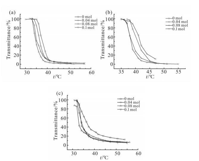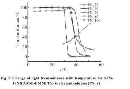 探究了P(NIPAN-b-DMMPPS)中PNIPAM嵌段含量對(duì)其臨界溶解溫度的影響,通過(guò)改變NIPAM與DMMPPS單體加料的比例,得到一系列PNIPAM嵌段含量不同的P(NIPAN-b-DMMPPS)嵌段共聚物。Fig.9為不同嵌段比例的表面活性劑溶液在500nm波長(zhǎng)下的透光率隨溫度的變化。