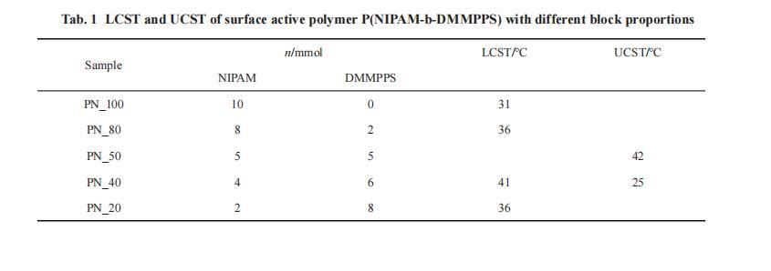 由圖中聚合物溶液透光率的變化可以得到不同嵌段比例的P(NIPAM-b-DMMPPS)的UCST和LCST,結(jié)果匯于Tab.1中。